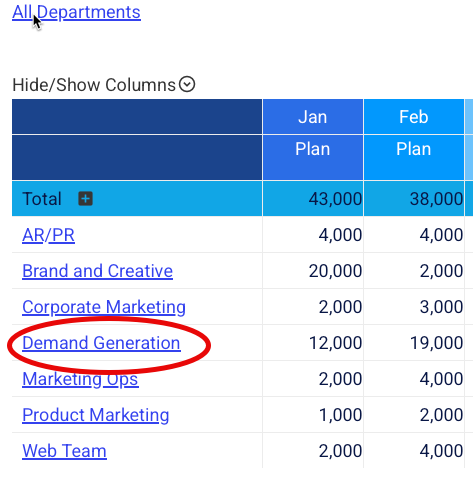 - Flexible pivot functionality to map marketing budgets to finance general ledger codes.