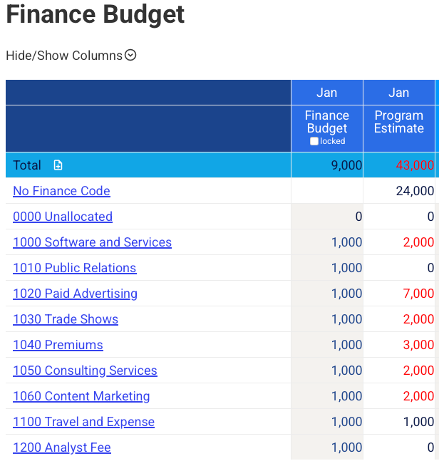 - Automatically pivot the budget from marketing programs to finance GL codes for easy finance discussions.