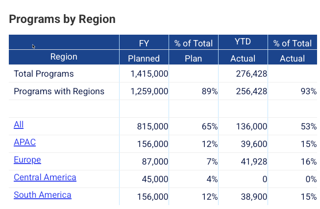 - Analyze budgets across various dimensions like product, region, or goal.