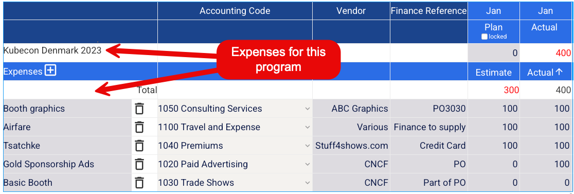 - Organize Expenses by Program: Create comprehensive budgets for any program—like a trade show—including categories such as T&E, booth rentals, customer dinners, and promotional items.